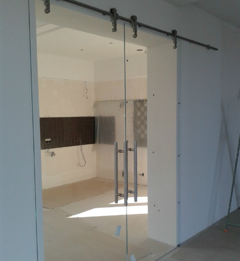 Проект: розсувні скляні двері з суцільноскляного безпечного скла з італійською системою Manetti.