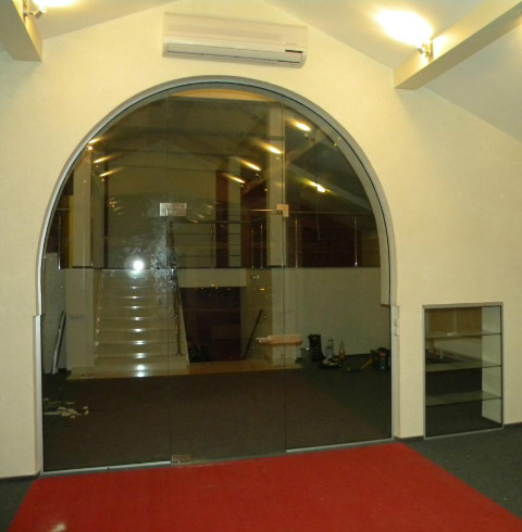 Проект: вхідна група в ресторан, арочного типу з маятниковими дверима (навстіж) з суцільноскляного безпечного скла.